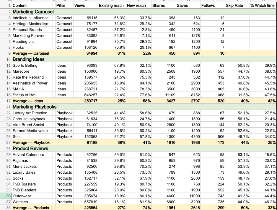 I shared this Excel screenshot of how I look at my analytics on social media the other week and it got quite a bit of interest in social media tracking. Let’s break down the pillars system I use (and how I’m doing analysis now using Agent Mode in Excel).