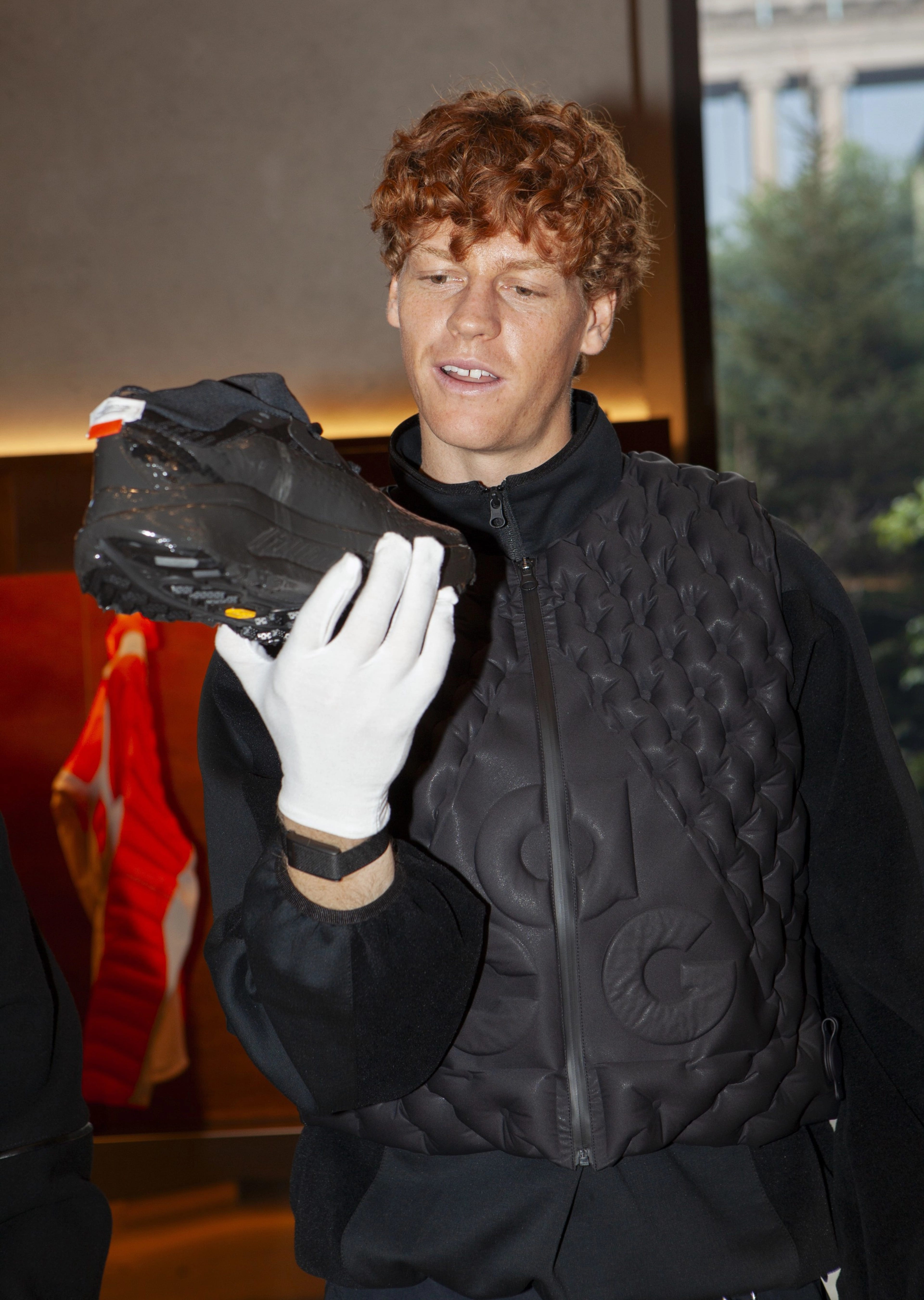 Nike leaned into that backstory with a bespoke one-of-one outfit through their Nike Atelier program; a custom GORE-TEX ACG jacket, A.I.R. vest, and dip-dyed Zegama trail shoes. There were no tennis references, instead they focused it as an homage to where Sinner grew up in Northern Italy.