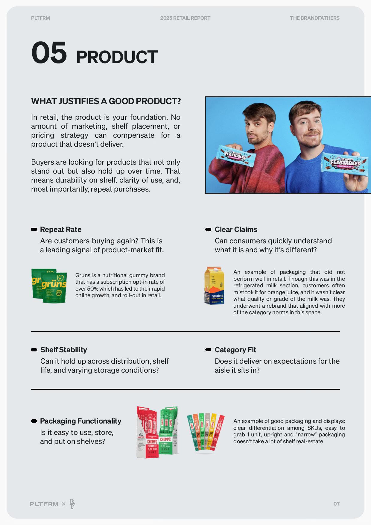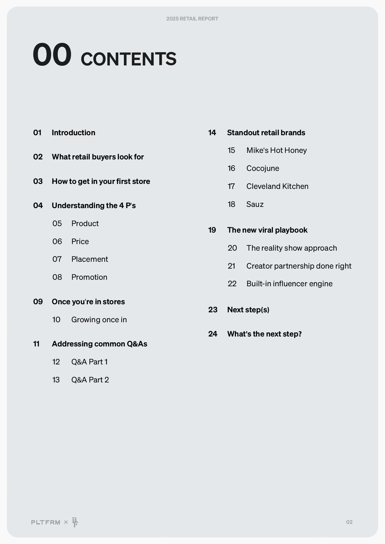 We (Ashwinn, Jordan Rodgers and I) interviewed Nichole from PLTFRM, a company that helps brands launch and scale inside of retail stores (and one that actually managed Amazon and Walmart for us when I ran marketing at Gel Blaster). We focused specifically on how to get started at retail, and then how to actually make sales and grow if you’re in retail but need momentum. It’s a super tactical, actionable Brandfathers episode, and we also put together a full written report with playbooks and case studies, available for free here (see the contents below)
