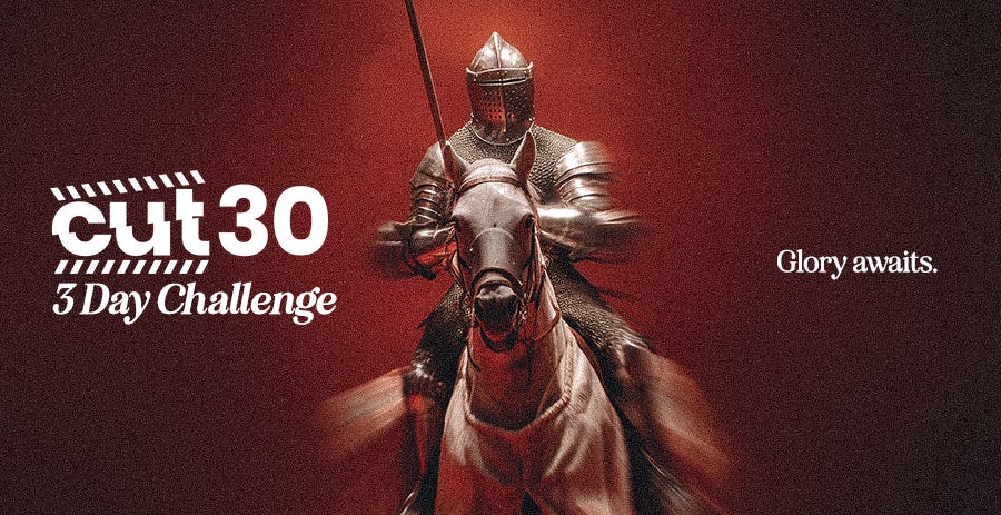 The legendary free Cut30 3-Day challenge, where video legends are made, returns next week. 3 days, 3 videos, no need to talk on camera. We give you performing frameworks for you or your brand on TikTok and Instagram, with a community of people. Whether chasing down your first 10k views, or just trying to improve your skills, we’re bringing it back, with a new set of challenges.
