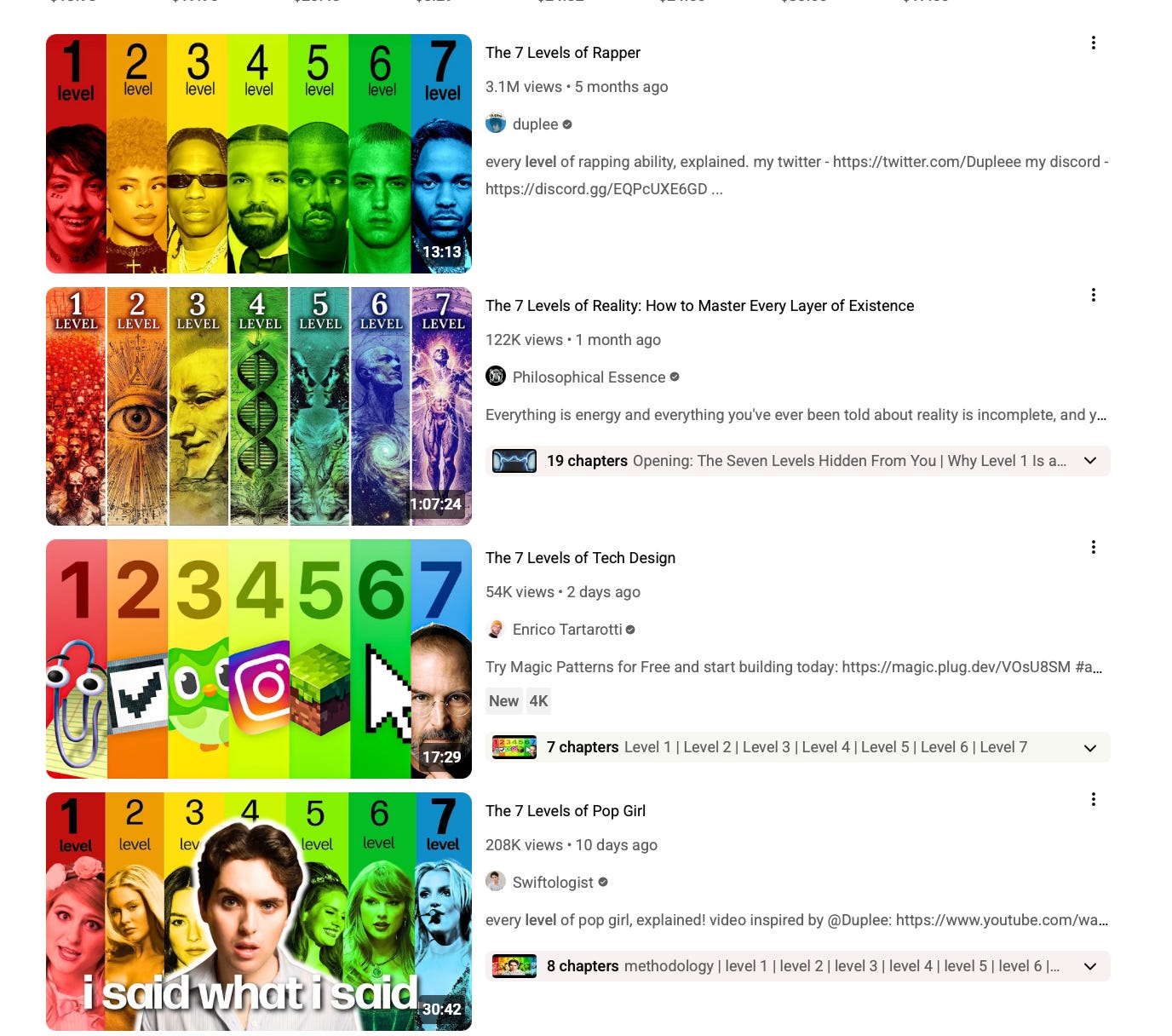 Example: “7 Levels Of ___” videos. A lot of people ran that format. I’d allocate about 25 percent of content to meta-riding.