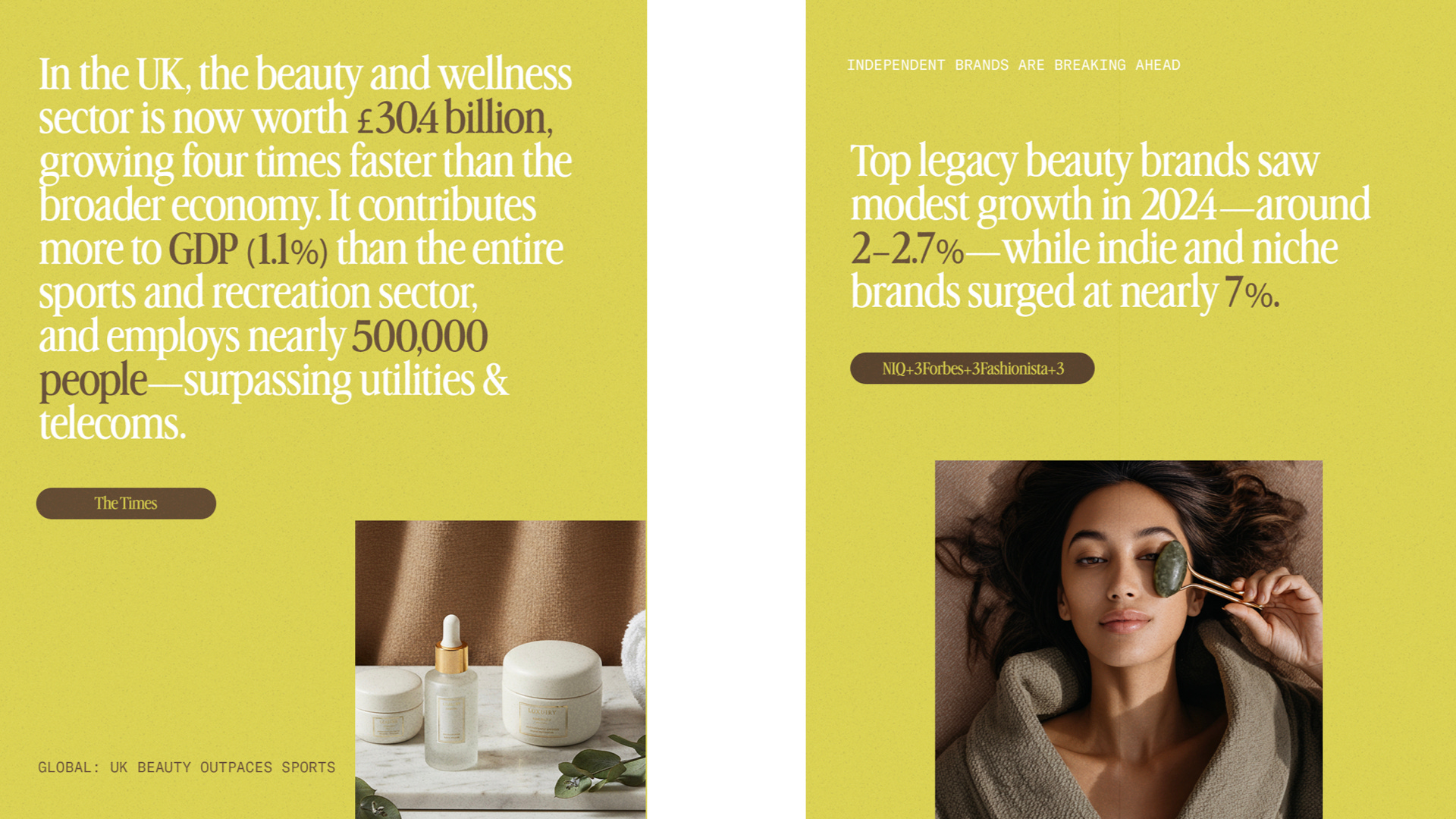 Frankly, the adoption and numbers are staggering., Beauty and personal care are surging in not just the US, but across the world - UK, India, China, Asia. Luxury brands like Dior and Louis Vuitton are dedicating sophisticated strategies to engaging customers in the category. The crossover between health and wellness and generation increasingly particular about what they put on and in their bodies is a major product turning point. And most importantly - independent brands are growing fast, showcasing the room for new players in the market.