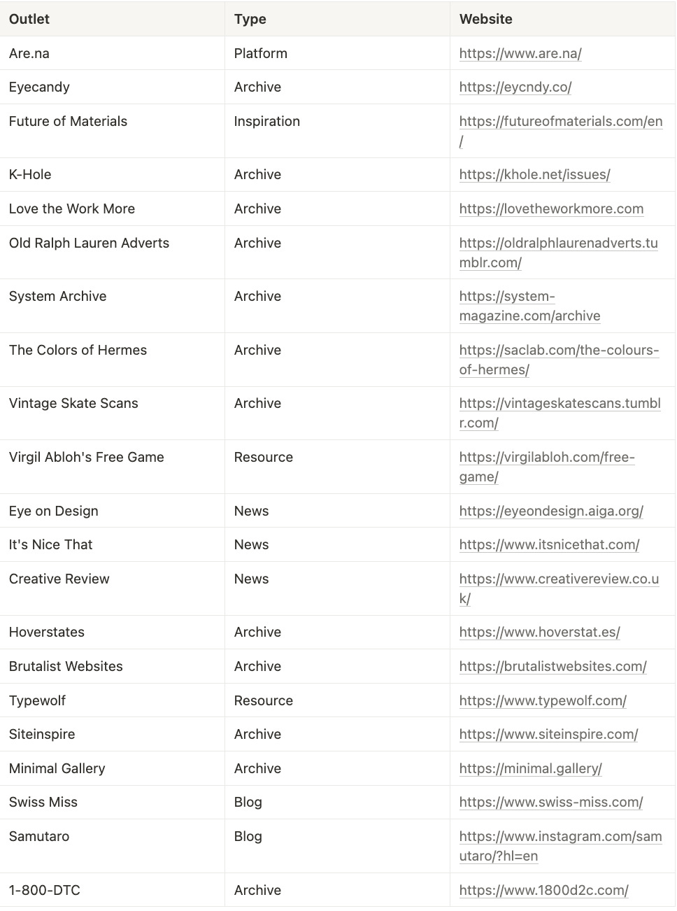 A great creative reference list from one of my favorite newsletters. Also, excellent advice re: finding creative references and remixing them at least 30%.