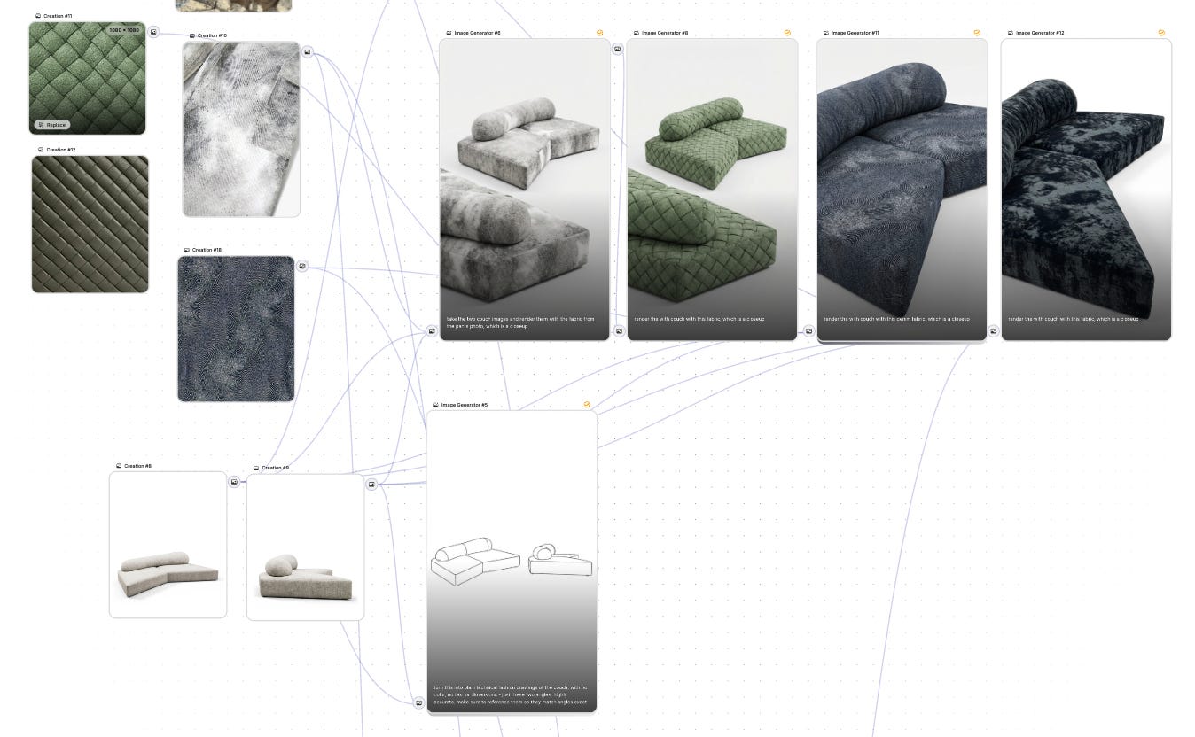 I bring in the materials, render out couch angles, connect them with a node to a image generation and prompt“render the couch with this fabric, which is a closeup”.